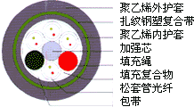 產(chǎn)品型號(hào): GYSTY53也叫(GYTY53) 光纖松套 纜芯填充油膏 金屬中心加強(qiáng)PE內(nèi)護(hù)套 雙面涂塑軋紋鋼帶粘結(jié)PE外護(hù)套 | ||||